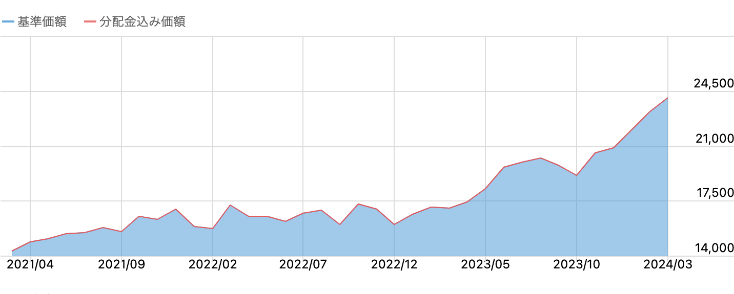 例えば、2021年から2024年のオルカンの価格チャートを見ると、円安が進む局面では価格が上昇する傾向があることが分かります。